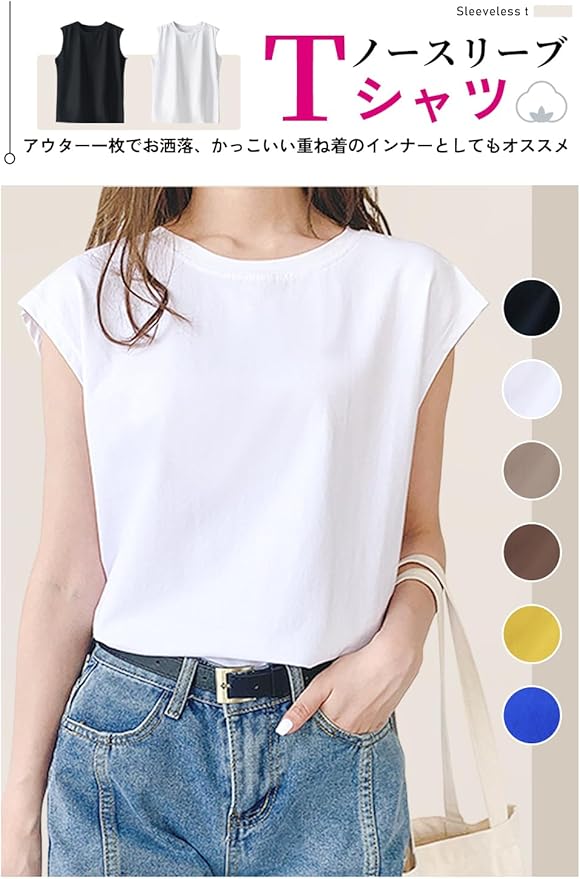 【多色展開 様々なシーンで大活躍】黒、白、ブラウン、カーキ、ブルー、イエロー のなど多色で展開、さまざまな人々の個性的なニーズや好みを満たすことができます。とてもスタイリッシュで実用的なレディースノースリーブTシャツです。ご注意:撮影環境やモニターの発色によって、実際のものと多少差別あるかもしれません。ご注意:淡色の衣装と分けて洗濯してください。