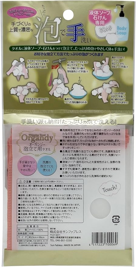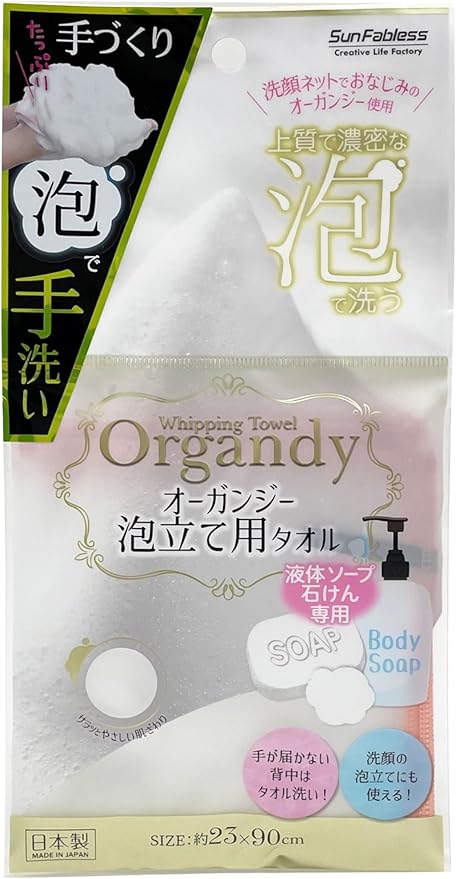 ●洗顔用泡立てネットでおなじみのオーガンジーのタオルなので、抜群のもっちり上質で濃密なたっぷりの泡で体を手洗いして頂けます。