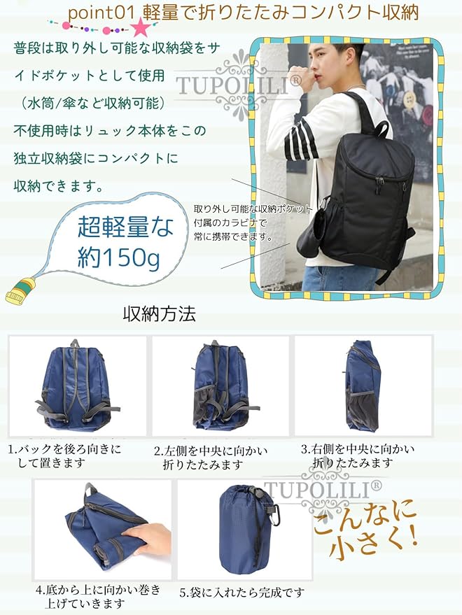 [TUPOLILI] 折りたたみ リュック 登山 買い物 アウトドア 軽量 通学 通勤 撥水 避難 携帯 コンパクト A4 タブレット レディース メンズ 旅行 バックパック ナップサック エコバッグ 収納 バッグ 防災 リュック ポーチ