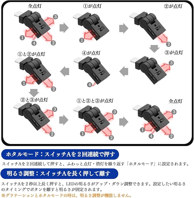 【照射方向切替・メモリー機能】usbライト180 回転可能で、必要に応じてスイングして狙った場所を照らせます。カラー記憶プログラムを搭載することにより、エンジン再始動後に前回設定カラーで点灯しくれます!面倒な再操作が不要でとても便利!