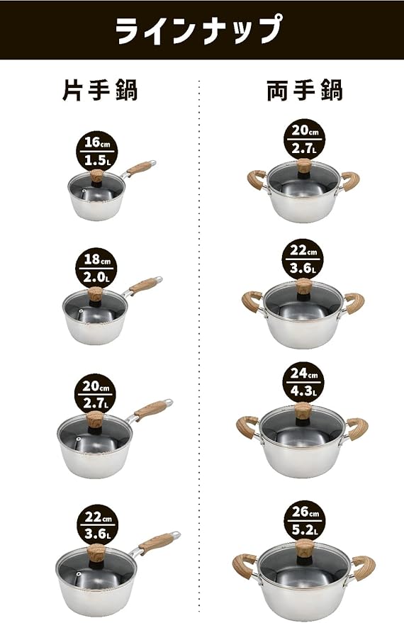 材料の種類: 本体/アルミニウム合金 ・はり底:ステンレス鋼(クロム18%) ・底の厚さ2.6mm (はり底を含む)