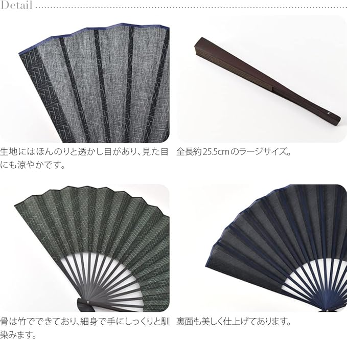 生地にはほんのりと透かし目があり、見た目にも涼やかです。骨は竹でできており、細身で手にしっくりと馴染みます。布扇子ですがかっちりと閉じます。
