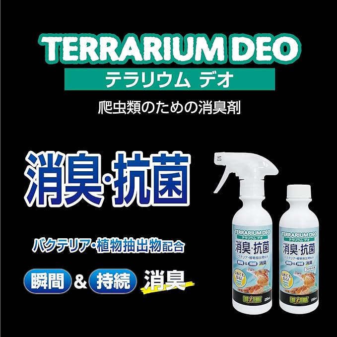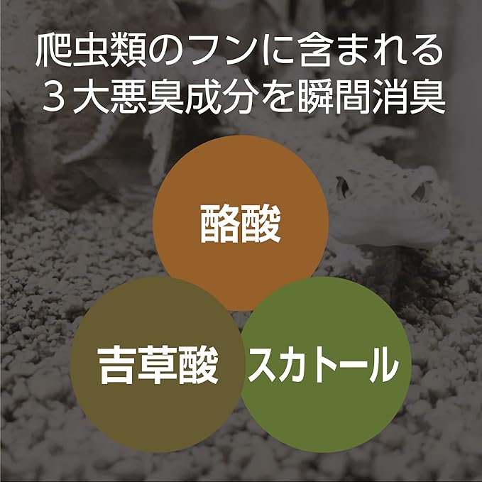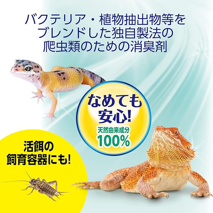 爬虫類の消臭剤。天然由来のバクテリアがケージ内の悪臭の元を分解して消臭。なめても安心な天然素材。森林の香り。