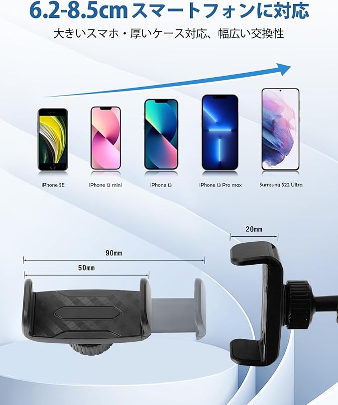 3.『360度回転』スマホ本体を固定する部分は360度回転できますので、ご愛車や個人ににより、一番良い位置に調整した後、固定できます。【全機種対応】本製品はコンパクトと機能性を兼ね揃えた車載ホルダーで、スマホホルダーの幅は50mmから90mmまで拡張ができ、ほとんどのスマートフォンに対応しています。iPhone 13 / iPhone 12 / iPhone 11 / 11 Pro / XR / iPhone X / XS / XS MAX / iPhone 8 Plus / 8 / SE / SE 2 / 7 Plus / 7 / 6 Plus / 6、または Galaxy S8 / S8 Plus / huawei / Xiao Mi / Xperia / Google Pixelなど全機種に対応できます。