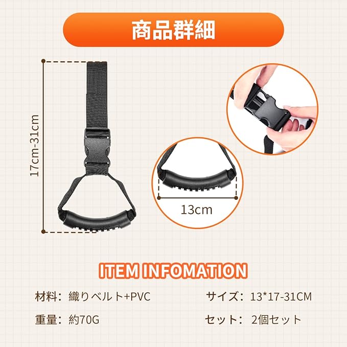 【耐久性も抜群】ベルト部分は、車のシートベルトで使われる素材と同じ素材ですので体重をかけて使用するシーンでも、安心の耐久性です◎ 【商品仕様】 ■「カラー」ブラック ■「サイズ」画像にてご確認ください。■「材質」PVC製