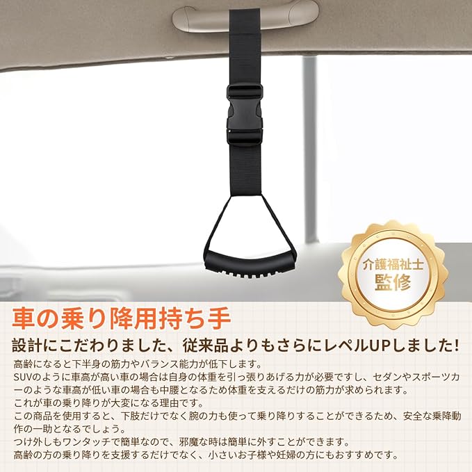 【乗り降りがラクになる車用持ち手】車用つり革は、車の乗り降り中の体を支えるサポートアイテムで、お年寄り、お子様、妊婦さんなど足場が不安定で乗り降りが難しく介護が必要なかたにもアシストグリップとしてお使いいただけます。不要な転倒防止に効果的なアイテムです。車内に取り付け可能な後付け持ち手。バックルタイプで取り付ける持ち手です。(純正グリップやヘッドレストにつりさげるだけの簡単装着。)