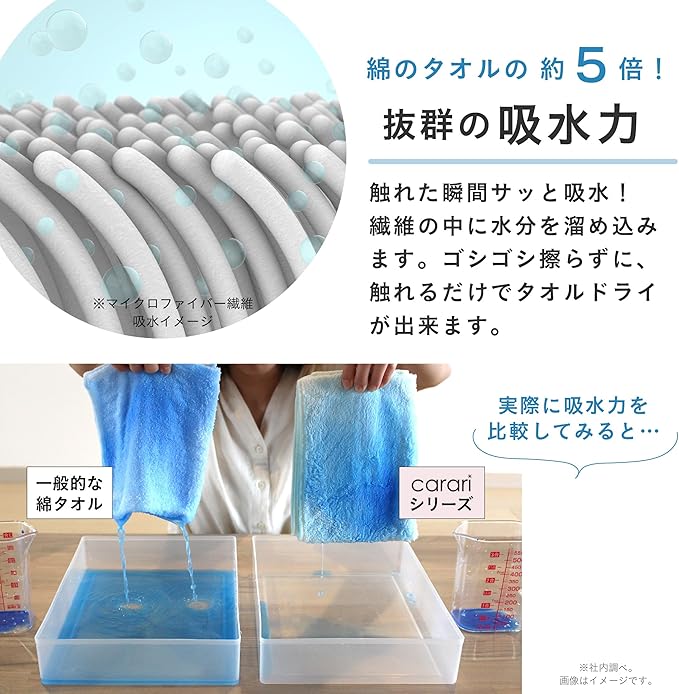【綿の5倍の吸水力】水に触れた瞬間、サッと吸水してくれます。その吸水力はなんと綿のタオルの5倍!まるでタオルが肌に吸い付くように、水分をしっかり吸水してくれます。摩擦による肌や髪へのダメージ軽減にもなり、タオルドライの時短になります。