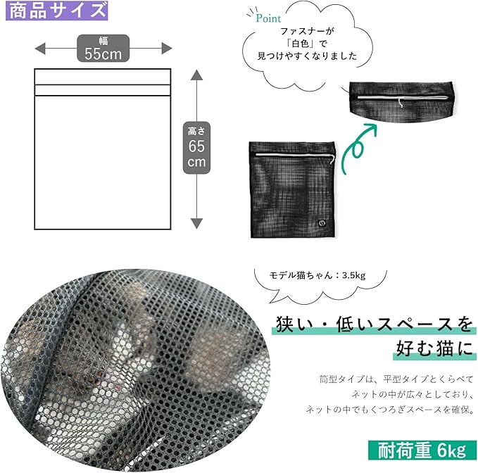 【大きいサイズ&ハリとコシのある素材でいれやすい】おちつくネットは縦65x横55cmのゆったりサイズ。大きい猫でも使えます(移動する場合は6kgまでの猫への使用を推奨しております)。またネットですが厚みがあり、ハリとコシのある素材なので、片手でネットの入り口を開けて猫を入れる時にも、開けた状態を維持できるので、いれやすくなっています。
