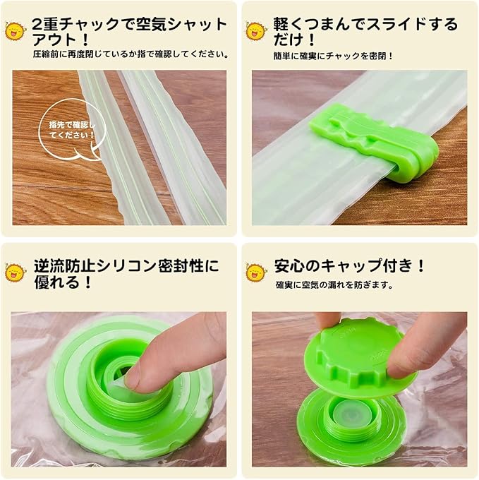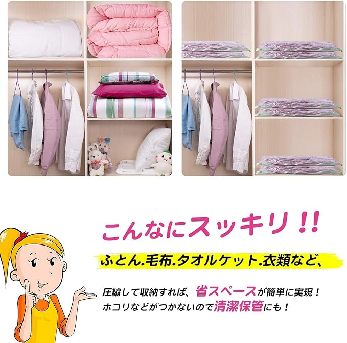 【品質保証】空気漏れなどの品質につきまして、何か問題がございましたら、ご遠慮なくお問い合わせください。ご注意:(1)羽毛布団と皮革製品に使用しないでください。(2)収納目安は約6ヶ月間です。半年を越えると圧縮率が低下して元に戻る場合があるので、1度取り出して天日干しするか、乾燥機で乾燥させてからもう一度圧縮してください。