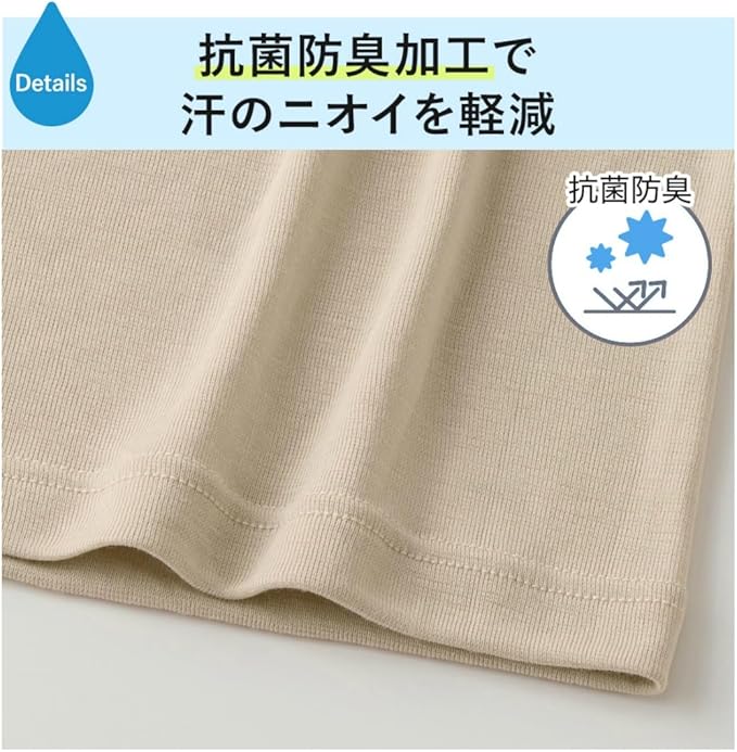 汗でべたべたしない、肌離れのいい素材でさらっとした肌ざわり+抗菌防臭加工で着心地も抜群。乾燥機対応素材。