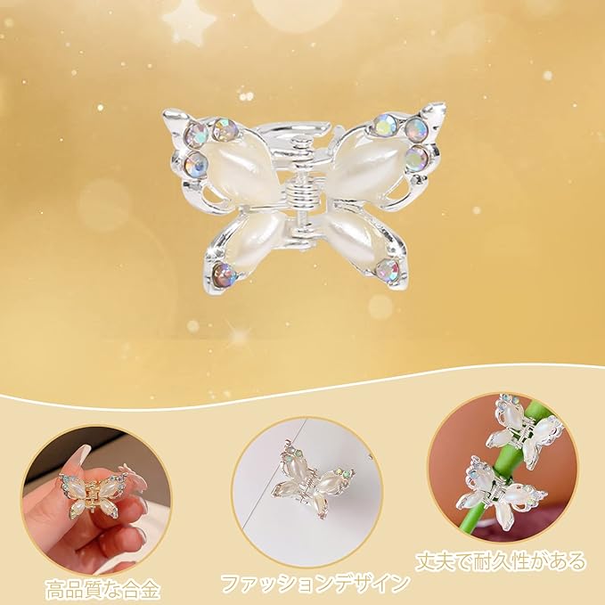 【ミニヘアクリップ】ミニサイズの蝶型ヘアクリップです。クリップにキラキラしているラインストーンが飾って、パールの翼はほんとに美しい。子供にも大人にもおすすめ!