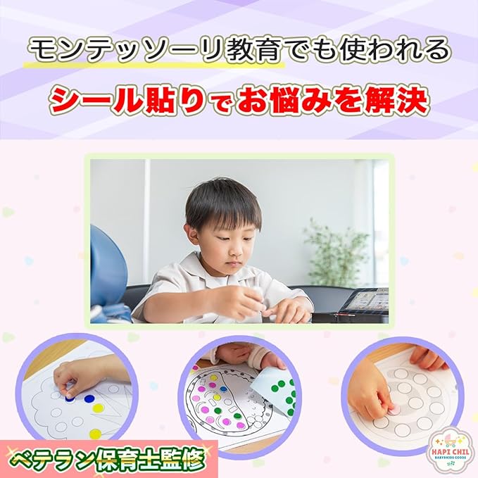 HapiChil モンテッソーリ台紙 30種類セット 【保育士監修】 知育 シール貼り & ぬり絵 丸シール16mmセット (15カラー 96個)