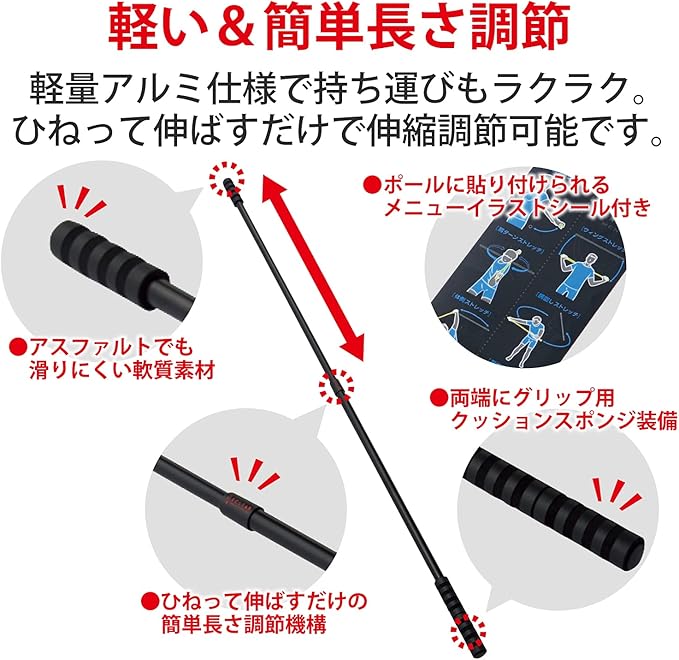 ■ ケガ予防と動ける体の準備を行うプログラムと長さ調節可能なウォーミングアップポールです。