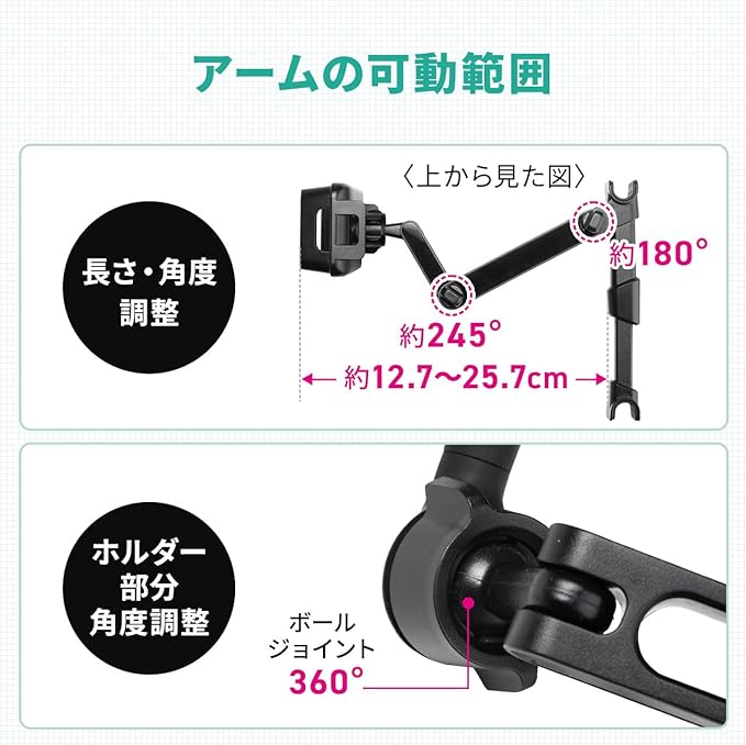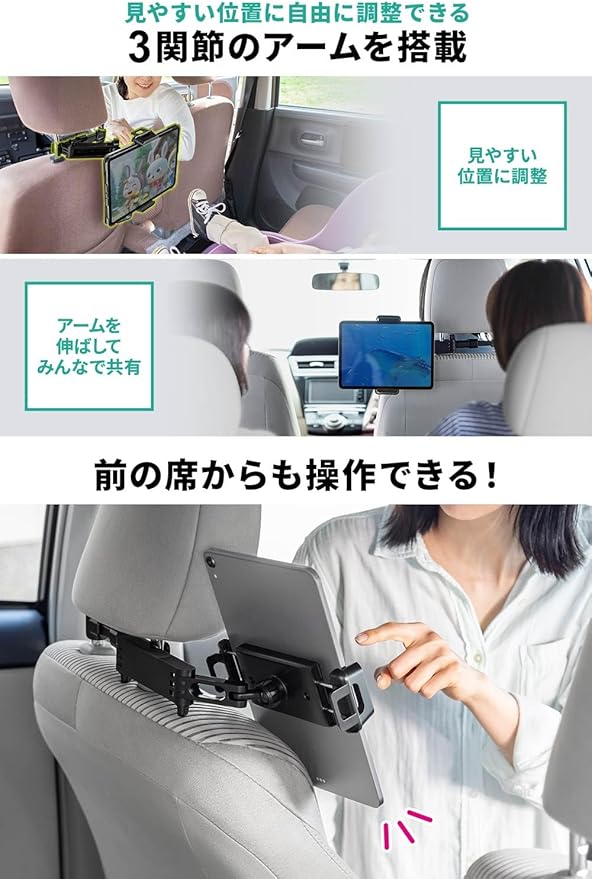 サンワダイレクト 車載タブレットホルダー ヘッドレスト固定型 伸縮アーム 360 回転 角度調整 後部座席用 7~13インチ対応 iPhone/Android/iPad対応 200-CAR108