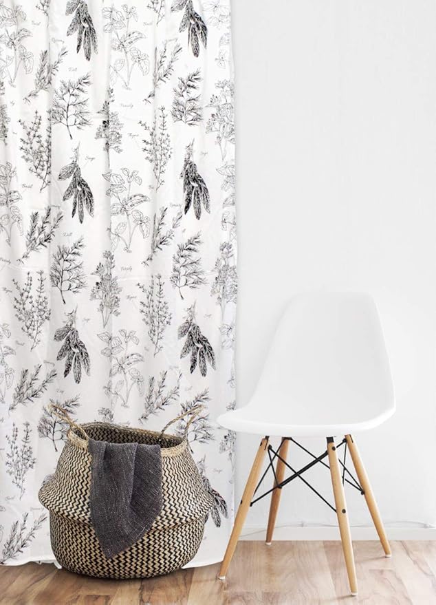 モノクロでボタニカル・イラストが描かれたインドコットンのカーテン