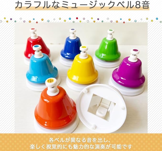 鮮やかな8色のミュージックベルセット。各ベルが異なる音を出し、楽しく視覚的にも魅力的な演奏が可能です。子供から大人まで、音楽の基礎学習や演奏の楽しさを体験できます。