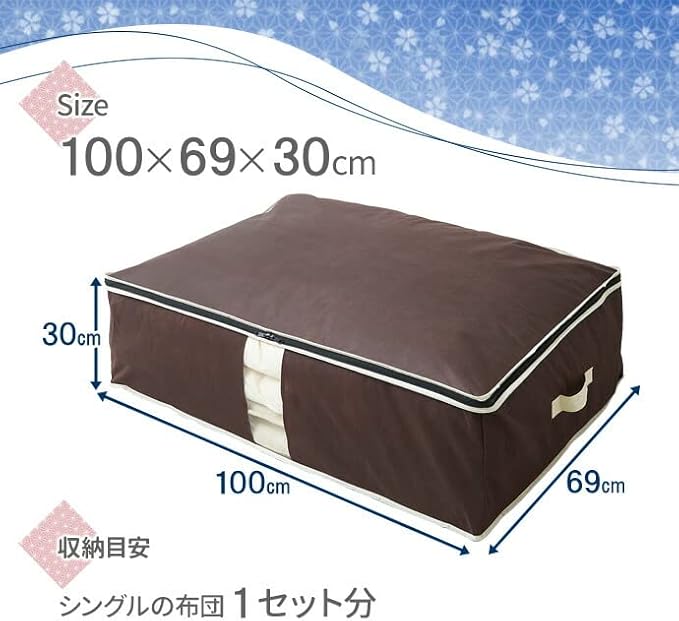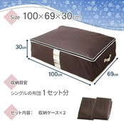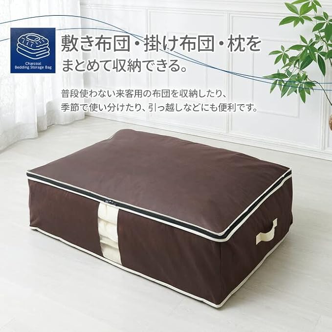 ■敷き布団・掛ふとん・枕をまとめて収納! シングルサイズの敷き布団・掛ふとん・枕をまとめて収納できる消臭機能付きの布団収納ケース。【まとめ買い2個セット】 幅広テープを使用して、布団一式をカンタンに収納できる布団ケースです。 透明窓付きなので、中身が見やすく、確認がラクラク。 ■気になる汗のニオイ・加齢臭を消臭! 炭加工シートを挟んだ不織布により、気になる汗のニオイや加齢臭を消臭!ふとんなどの寝具にニオイがつくのを防ぎ、通気性も抜群です。 ※炭加工シートは底面(キルト面)に使用しています。 ■持ち運び簡単 両サイドには丈夫な持ち手付き。不識布製なので軽く、持ち運びがカンタンです。 ■ラクラク収納 幅広テープを使用して、かさばる布団を固定できるので、ラクラク収納できます。 季節ごとに入れ替えたり、普段使わない来客用布団の収納にも使えます。 ■コンパクト収納 使わないときは、折り畳んでおけば場所をとらずコンパクトに収納できます。
