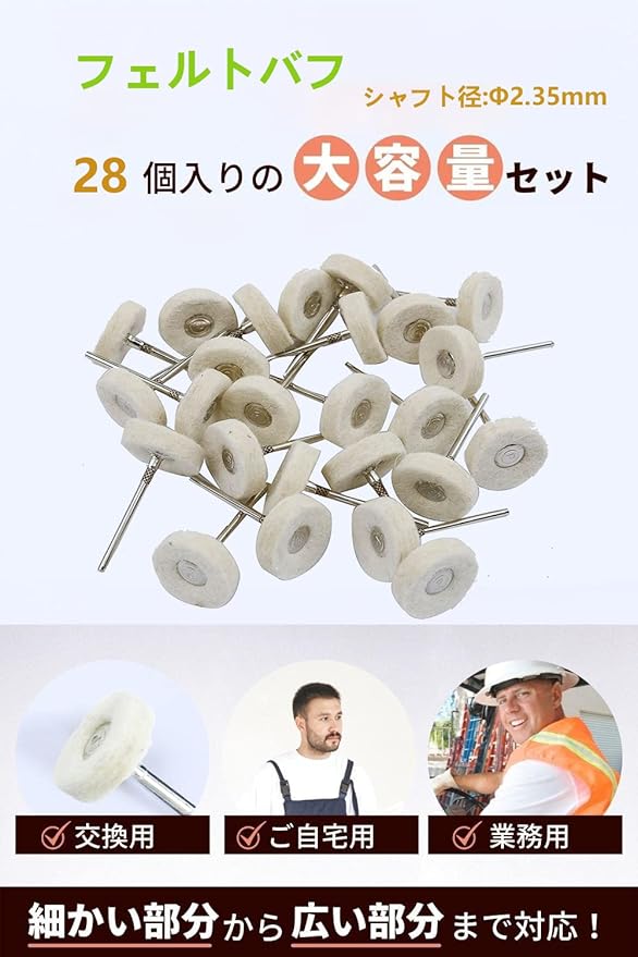 AmoYoung リューター バフ 2.35mm 28個入り ホイール型 鏡面研磨や金属磨き仕上げ ルーターバフ フェルト バフ