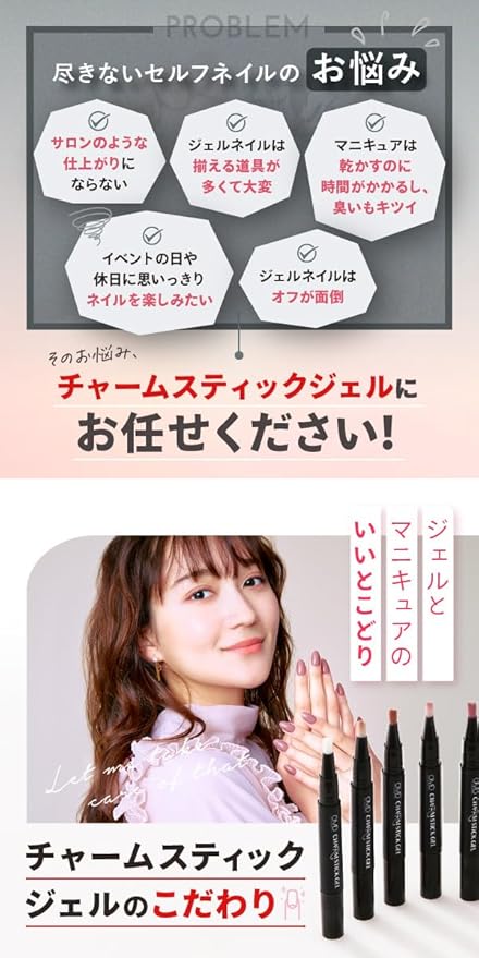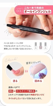 [使用方法] ・持ち手がダイヤル式で、回転させると穂先からジェルが出ます。・使い始めはすぐにジェルが出ない場合があります。様子を見ながら5回~10回程度回してください。 ・使用前は穂先にジェルがついていません。ご使用時に持ち手を回してジェルを出し、ブラシによく馴染ませてからご使用ください。 ・ジェルを出す際はブラシの穂先を上にしてにジェルが出てくるのを確認してください。確認せずに回し過ぎるとジェルを出し過ぎる恐れがあります。 ・手洗いや油分除去溶剤で爪の余分な油分、汚れを除去し清潔な爪に適量乗せてUV/LEDライトを照射し硬化します。 ・硬化時間はライトによって異なりますので、触ってもベタつかなくなるまで照射してください。 ・一度に塗る量が多すぎると「硬化不良」を起こす原因になりますのでご注意ください。(硬化不良:ジェル表面がシワシワに縮んだり、中が半熟の状態になります)・使い始めはすぐにジェルが出ない場合があります。様子を見ながら5回~10回程度回してください。【参考ワット数】 36WのLEDライト照射時:20秒で硬化 【使用回数(目安)】 10本2度塗りで約10~15回程度