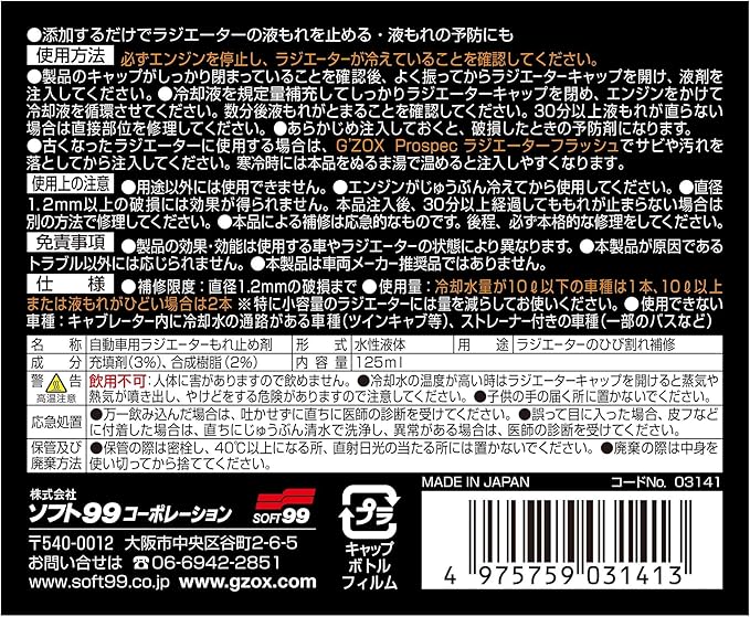 ソフト99(SOFT99) 整備ケミカル ラジエーター関連 プロスペックラジエーターモレ止め ラジエーターのひび割れ補修 03141