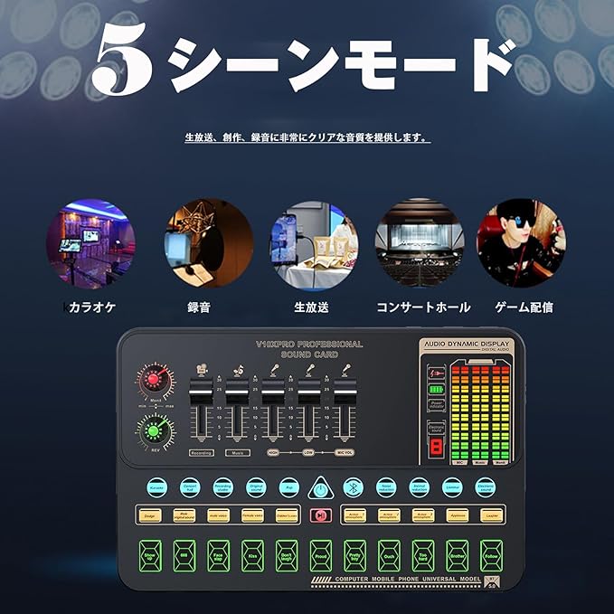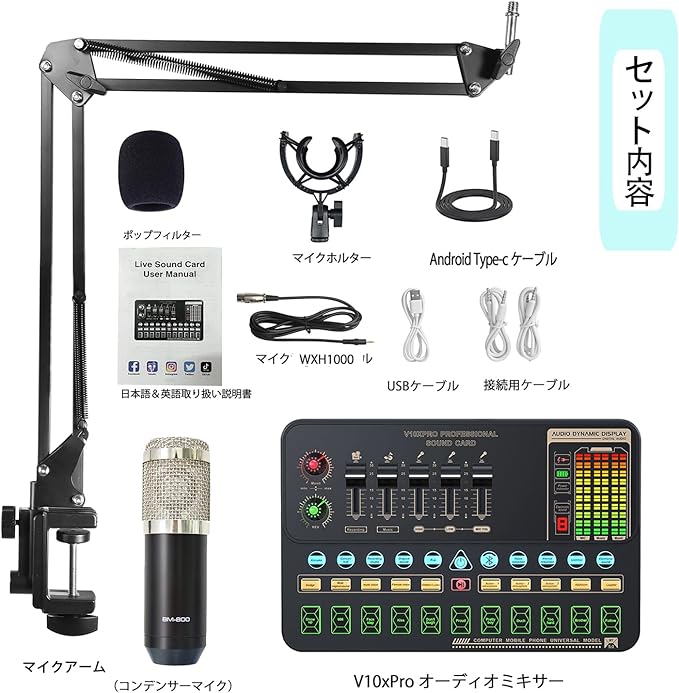 オーディオミキサー 配信機材セット オーディオインターフェース USBコンデンサーマイク LEDリングライト ゲーム実況 配信 生放送 ボイスチェンジャー PC スマートフォン対応 (V10)