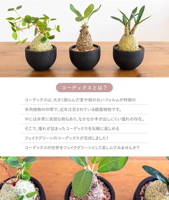 ✅多肉のようで盆栽のような人気者、コーデックスのフェイクグリーン。水やりなどのお手入れいらずで気軽に取り入れられる人工観葉植物です。