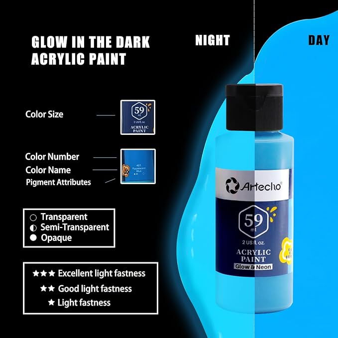 鮮やかな色:Artechoアクリルグローペイントセットには、ネオンと暗闇で光る6色があり、それぞれ2オンス/59mlのボトルに入っており、便利なフリップトップが付いています。