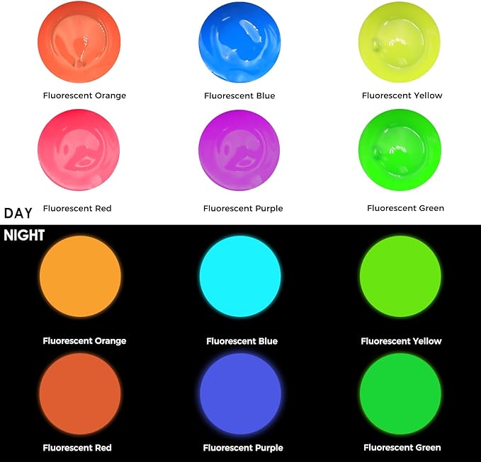 【高品質で長持ち】当社のグロー&ネオンペイントセットは、高品質の顔料を使用し、光沢仕上げと耐光性を提供します。 塗料は暗闇で光り、日光の下では蛍光を発し、美しい発光効果を提供します。
