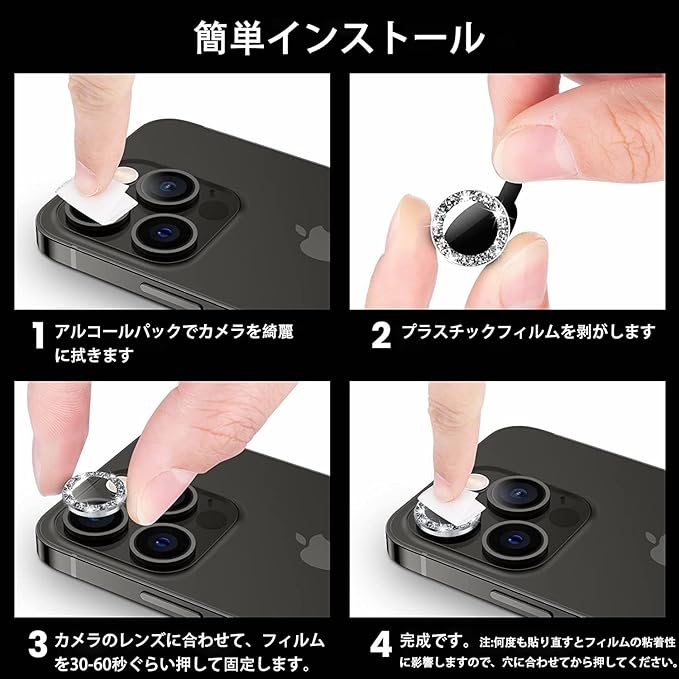 【貼り付け簡単】フィルムの粘着面はナノ静電吸着技術を処理され、位置を合わせて軽く置くだけで気泡が入ることなく簡単に装着できます、誰でもきれいに貼ることができます。【パッケージ内容】iPhone 16 Pro 対応 / iPhone 16 Pro Max 対応 カメラカバー 3枚。