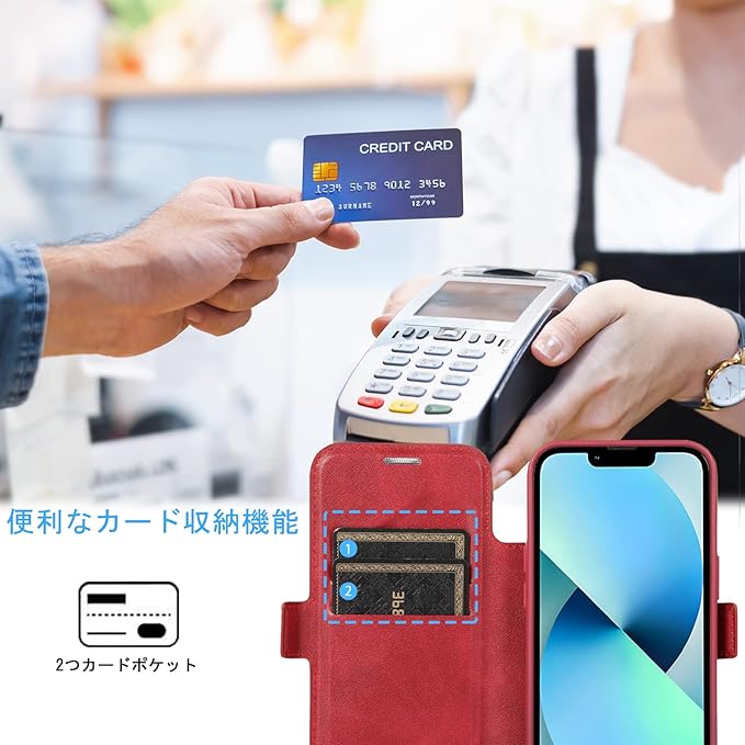 「優れる収納力」手帳型ケースならではの、とっても便利な機能。必要最低限の2つカードポケットを設計された。ICカードを入れる事で電子マネー決済や、通学通勤の改札利用がスマートに!