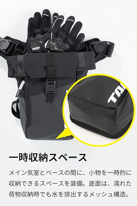 防水仕様のメイン気室で雨天時の使用も可能な大型レッグポーチ。太ももに装着するタイプで、車両に跨ったままでも荷物の出し入れがしやすく、身軽な状態でライディングを楽しめます。体に沿ったベース形状と回転式のバックルで体にフィットし、ライディング時の動きに追従します。