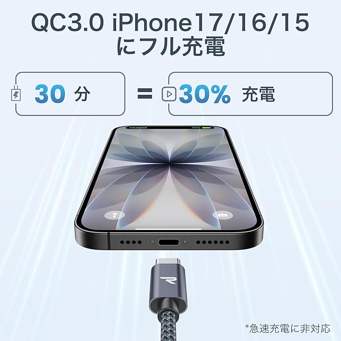 【快適なQC3.0急速充電】⚠️⚠️iPhone 17/16/15シリーズのスマートフォンを充電する場合、充電電力は12Wで、急速充電には対応していません。当社のUSB CケーブルはQuick Charge 3.0に対応し、3.6V〜20V/3Aの高速充電が可能です。お使いのスマートフォンやタブレットなどのデバイスを短時間でフル充電し、貴重な時間を節約できます。急いでいる時でも便利で利用できます。USB2.0基準、最大480Mbpsのデータ転送速度をサポートし、1GBのファイルを数秒間で転送完了します。