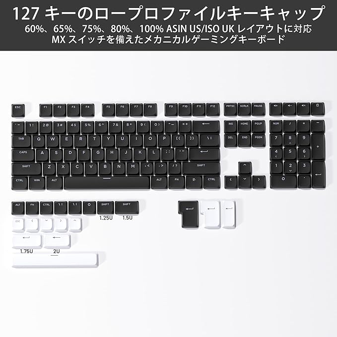 【広範な互換性】この127キーキャップセットは、104標準キーと23の追加キーで構成されており、MXステム(クロス形)スイッチを搭載したASIN USレイアウトの60%/65%/70%/75%/80%/100%のメカニカルキーボードに互換性があります