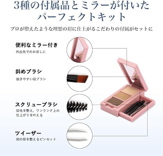 ✅【専用のアイブロウブラシ(眉ブラシ)&ツイーザー&ミラー付き!理想の眉を整えるキット】 眉メイクのプロが監修した専用のアイブロウブラシ(眉ブラシ)が2種類と、ツイーザー、メイクに便利なミラーがセットされています。一般的なアイブロウパウダーが単品のみの提供が多い中、これ一つで眉メイクが完結する充実したセット内容が魅力。外出先でのメイク直しもスムーズに行え、いつでも完璧な眉をキープできます。