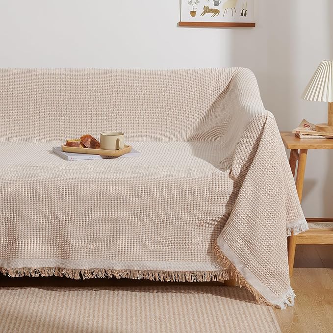 Atokazo ソファーカバー 北欧風 マルチカバー ソファカバー 肘付き 肘なし 多機能 ブランケット 綿 リバーシブル フリンジ付き おしゃれ 保護カバー 防塵 キズ防止 汚れ防止 洗える 四季通用 大判 カーキ・ワッフル柄 180X340cm(3~4人掛け)