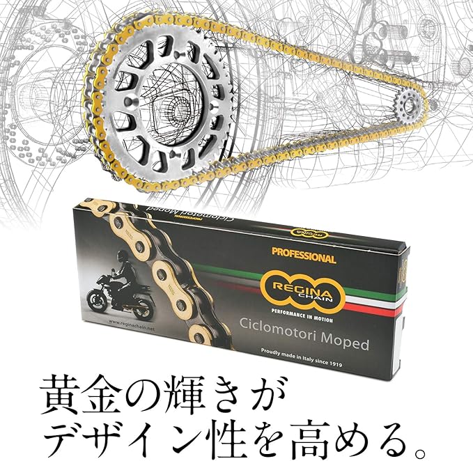 「自分のバイクにちょうどいい」。リンク数を細かくラインナップし、切る手間を省きました。ラジオペンチひとつで脱着可能なクリップジョイントを採用。カシメの手間を省略しています。強度とデザイン性を備えたREGINAゴールドチェーンに、レースで培われた技術とパフォーマンスを反映させました。