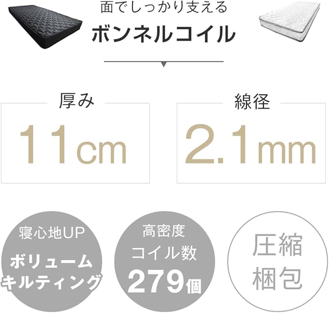 タンスのゲン マットレス セミシングル ボンネルコイル 厚み11cm 高密度 コイル数279個 硬め ベッドマット 通気性 ベッドマットレス ホワイト 17800075 00(64556)