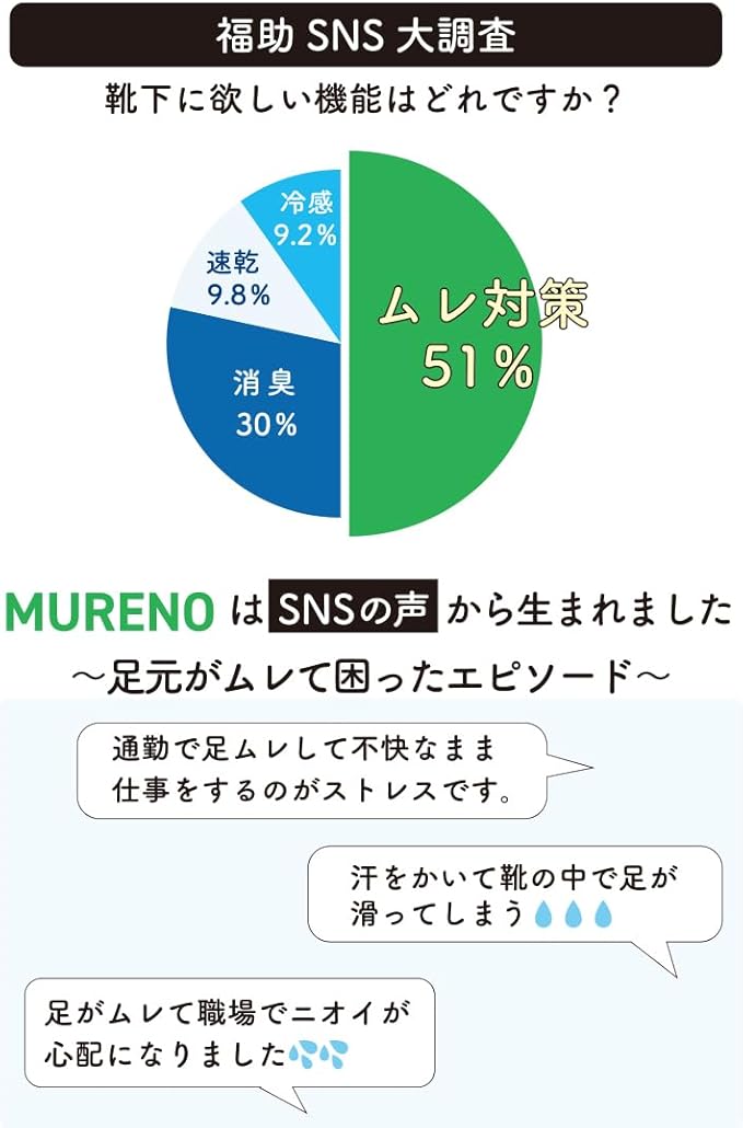吸水性の高い綿と乾きやすいポリエステルを使用したムレにNO!!な靴下の登場です。肌側に消臭糸を使用し、機能的で快適な5本指ソックスです。