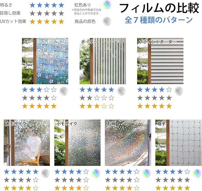 ※直射日光を多く受ける ワイヤー・網入りガラス、複層(ペア)ガラス等に射熱吸収率の高いフィルムを貼ると熱割れが起こる可能性がございます。 ※本商品は室内側貼り専用タイプです。室内側ガラスが凹凸やザラザラと感じるガラスは施工できません。