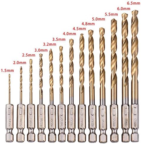 NUZAMAS 1/4 "六角シャンクHSSドリルビット、13枚のチタンコーティングドリルビット、1.5mm-6.5mm、木工用高速スチールクイックチェンジ、プラスチック