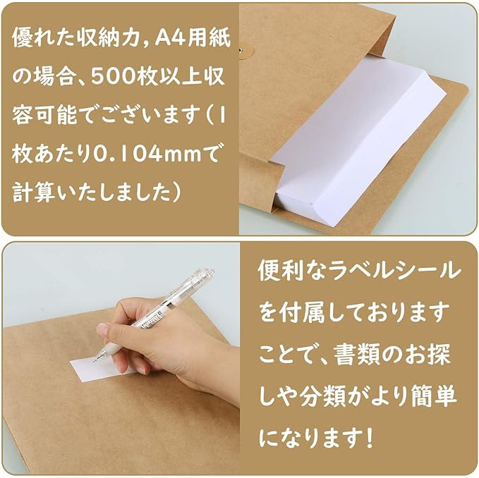 【サイズ】34cm 24cm 8cmの紐付き封筒はA4用紙500枚以上収納可能な大容量設計で、厚手書類もすっきり整理いただけます(1枚0.104mm換算)。