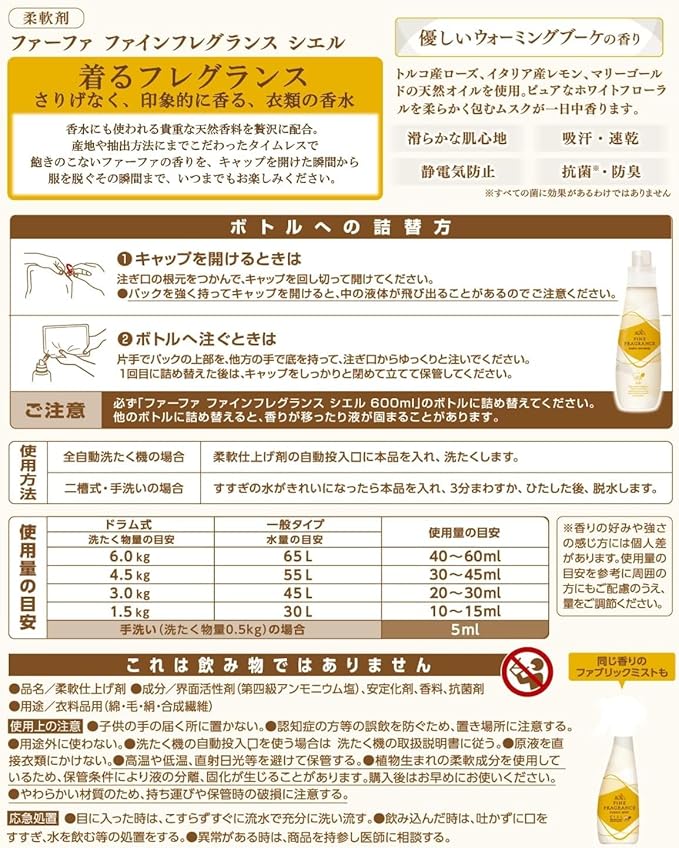 ファーファ ファインフレグランス 液体 柔軟剤 シエル 500ml詰替 ●原料、製造方法からこだわった香りにリニューアルした「ファーファ ファインフレグランス」から新香調「シエル」が登場しました。 ●老若男女問わずお使いいただける、優しいウォーミングブーケの香りです。飽きが来ない香りで、長くお使いいただけます。 ●繊細な香りを守ります。 ●即効性、持続性のある2種類の抗菌成分を配合しました。菌の増殖を抑え、部屋干しでも衣類を嫌なニオイから守ります。※すべての菌に効果があるわけではありません。 ●レモンやグリーンアップルの自然で爽やかなトップノートに、みずみずしく透明感のあるフリージアやライラック、シクラメン等の白色基調の優しいフローラルブーケを、柔らかなムスクとアンバーで心地よく包む親しみのある香りです。
