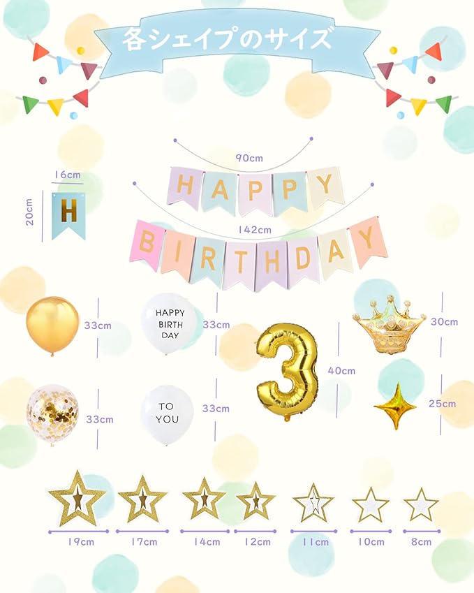 輝くセット&数字バルーン&お買い得:キラキラしている 誕生日 飾り付け セット&新しい風船セットを追加!!!セット内容:①「HAPPY BIRTHDAY」ガーランドバースデーガーランド 1セット ②王冠バルーン 1 ③紙吹雪風船 6 ④数字バルーン 1 ⑤星型アルミバルーン 2 ⑥星のガーランド 1セット ⑦吸込管 1本 ⑧ゴールドリボン 10m ⑨ドットシール 20点 ⑩カスタマーサービスカードx1. 追加風船セットの内容:ゴールド風船 4、HAPPY BIRTHDAY TO YOUバルーン 1セット