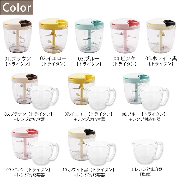 素材:[本体]トライタン(飽和ポリエステル樹脂)(耐熱温度120度) [ふた]ポリプロピレン(耐熱温度100度) [取っ手]ABS樹脂(耐熱温度100度) [刃]ステンレス刃物鋼