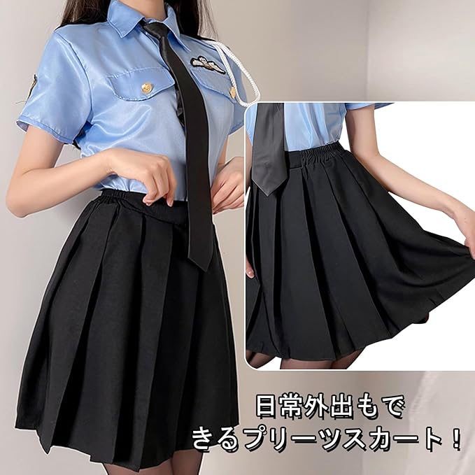 セット内容:半袖トップス、ミニスカート、ネクタイ、帽子、サングラス、ベルト、パンツのフルセットです。(サングラスや靴は付属しません。小物のデザインや色味は変更となる場合がございます) 定番の警察服のコスチュームセットで、下着はプリーツスカートに変え、青春に戻られるかわいい感をくれます!