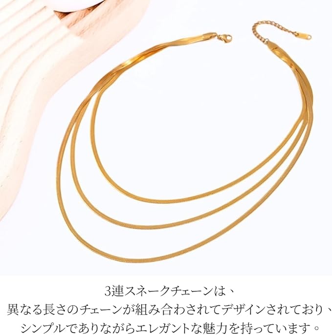 デザイン性: 異なる長さのスネークチェーンを組み合わせた3連デザイン。洗練された重ね付け効果を一本で実現