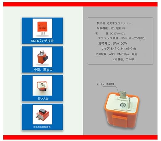 2ピンタイプ12Vのほとんどのオートバイクに対応、点滅速度調整可能