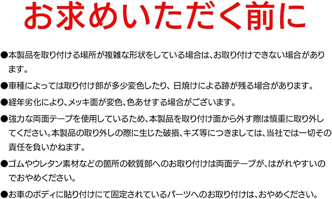 本製品を取り付ける場所が複雑な形状をしている場合は、お取り付けできない場合があります。車種によっては取り付け部が多少変色したり、 日焼けによる跡が残る場合があります。経年劣化により、メッキ面が変色、色あせする場合がございます。
