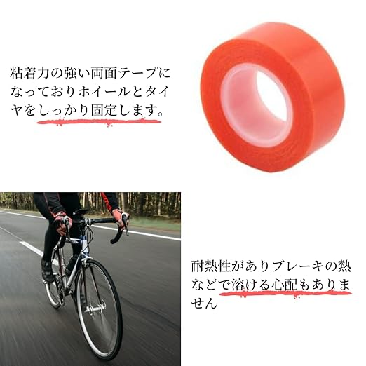 粘着力の強い両面テープになっており、ホイールとタイヤをしっかり接着します。 耐熱性がありブレーキの熱などで溶ける心配もありません