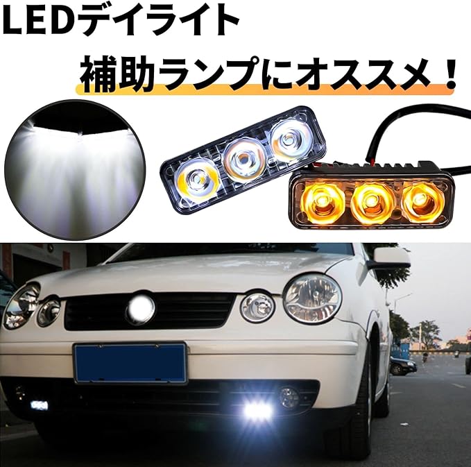 車用デイライト、フォグランプです。3連LEDで明るく視界を確保します。